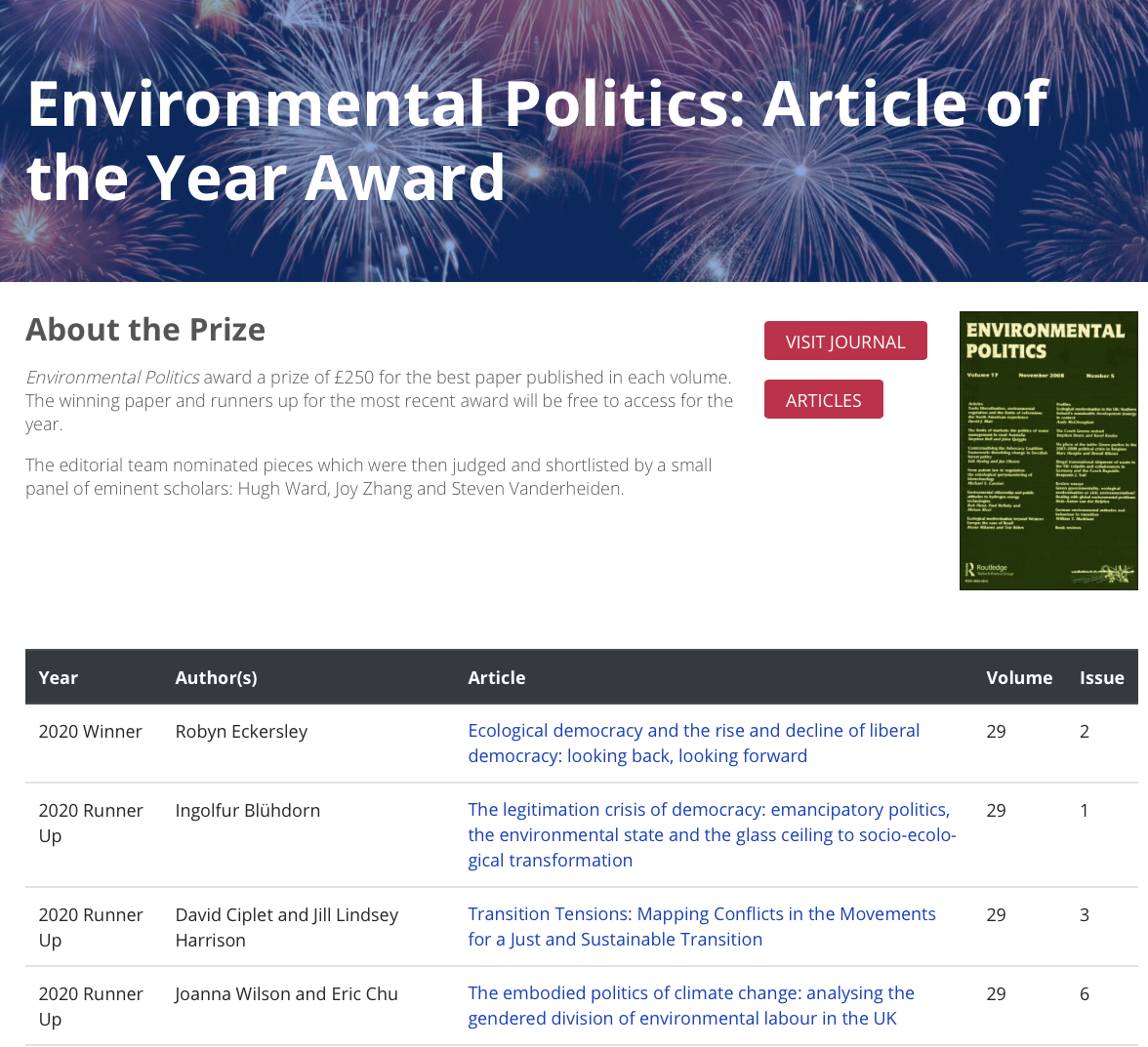 Many congratulations to the winner and the runner-ups of the 2020 Article of the Year Award for Environmental Politics !!