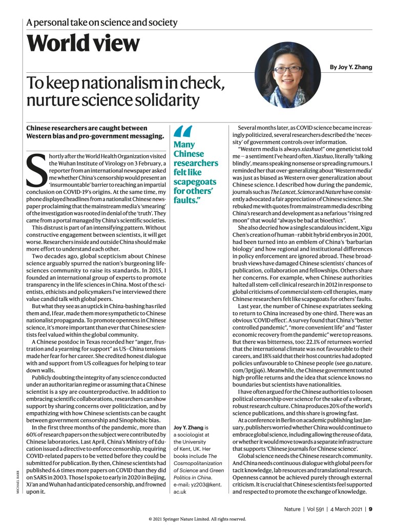 I think everyone is getting tired of the politicisation of COVID and the blame games – both Chinese and Western politicians bear responsibilities. Yet the victims of China-bashing are not limited to China and its citizens. It has serious implications for global science. Here is my short piece on how Western media may unwittingly help reinforce a nationalist rhetoric in China and what the scientific community can do to promote openness: https://www.nature.com/articles/d41586-021-00458-5
