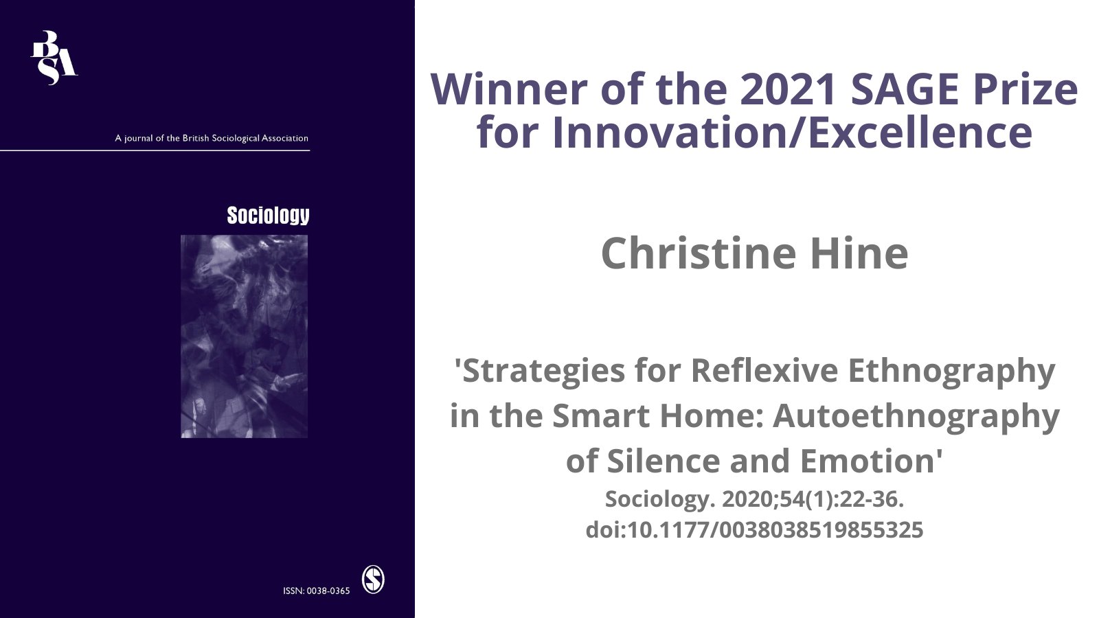It was a great pleasure to be on the judging panel with Dr Ala Sirriyeh at Lancaster and Prof Ian Tucker at University of East London for this year’s SAGE Innovation/Excellence Prize for the journal, Sociology. It was not easy to decide on a winner as all shortlisted papers were exceptional in their own ways – many congratulations to all the nominees! But we all agreed to this year’s prize should be given to Professor Christine Hine’s paper. Here is our joint statement on the award: