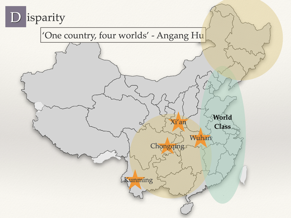 For this SGroup presentation, I was able to squeeze in some answers regarding the second question. Economist HU Angang once famously described the situation in China as ‘one country, four worlds’. Although he was referring to the socio-economic development stages, I thought similar things could be said about China’s HE development. So I made a demo with the following slide. Naturally it is only an indicative demo. But it was useful to kick off frank and differentiated conversations about engaging with Chinese institutions.
